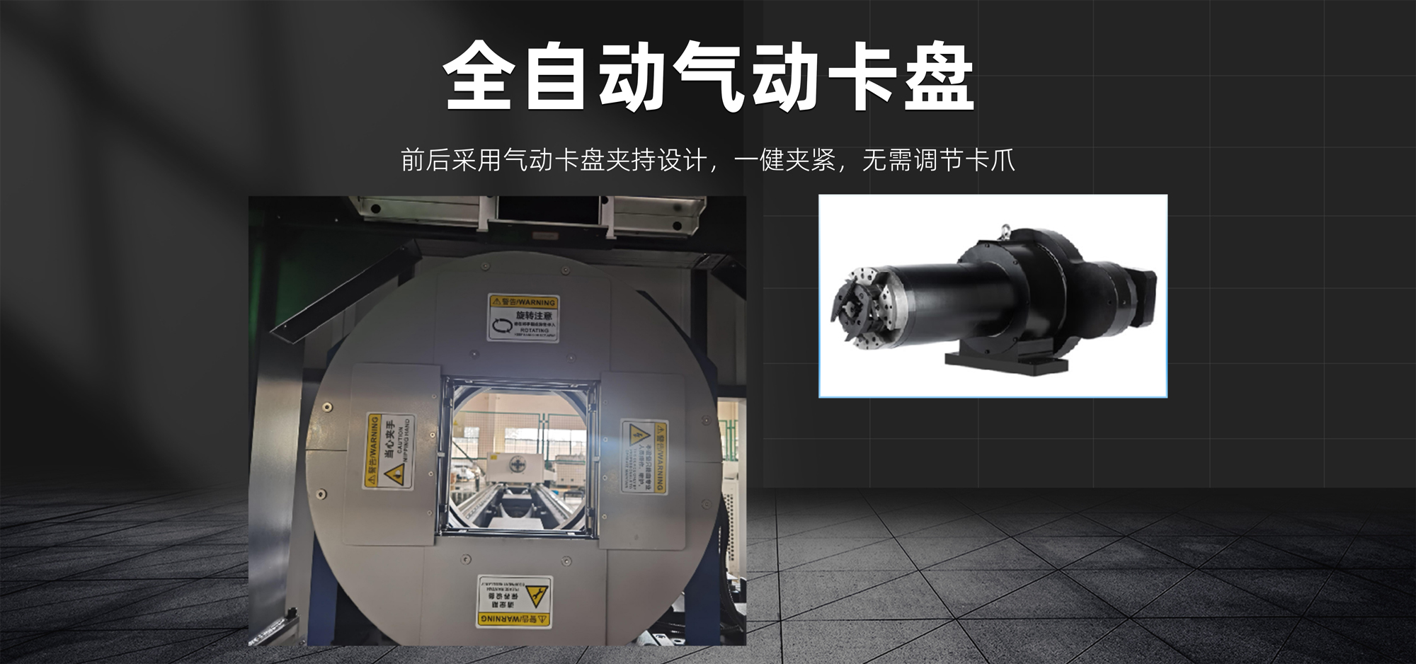 前后采用氣動卡盤夾持設計,一鍵夾緊,無需調節卡爪