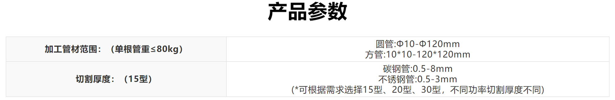 | 切割厚度:(15型) | 碳鋼管:0.5-8mm 不銹鋼管:0.5-3mm (*可根據需求選擇15型、20型、30型,不同功率切割厚度不同) |